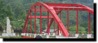 鏡頭再轉到一座紅色弧形的鐵橋,叫「土場大橋」,橋身欄杆還有原住民的畫作圖騰,山谷下面霧氣頗濃,彷彿都市的煙塵廢氣……