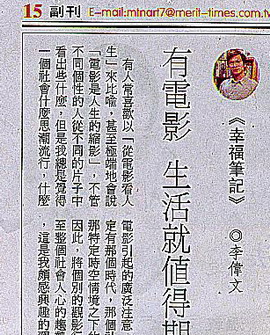 有人常喜歡以「從電影看人生」來比喻,甚至極端地會說「電影是人生的縮影」,不管不同個性的人從不同的片子中看出些什麼,但是我總是覺得一個社會什麼思潮流行,什麼電影引起的廣泛注意,背後一定有那個時代,那個社會,在那特定時空情境之下的原因,因此,將個別的觀影行為回溯至整個社會人心的趨勢或脈絡,這也是我頗感興趣的觀察點。