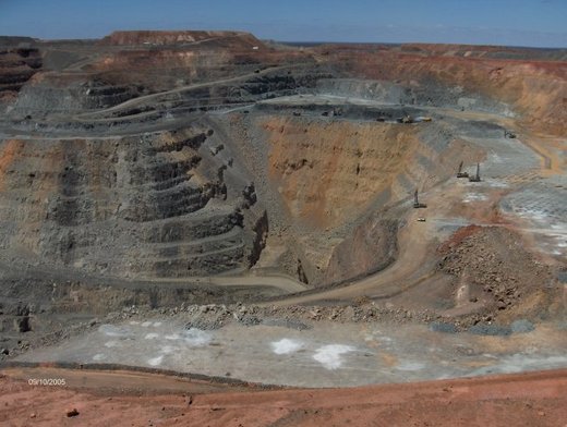 在中國大陸和台灣生活的人是無法想像澳大利亞的鐵礦石的儲藏情況,拿西澳大利亞和南澳大利亞省來說,鐵礦石的儲量大到難以想像,礦區面積是若干平方公里,埋藏深度都是在數米以上,也就是說,上面只有薄薄的一層表土,用推土機推開表土,用炸藥炸開,就可以直接裝車運往碼頭。現在正在開採的,都是露天礦,也就是說,表土都不用推開,直接用炸藥炸開就可以裝車運走。我從當地的媒體上下載了一副圖給大家一個例子看看。