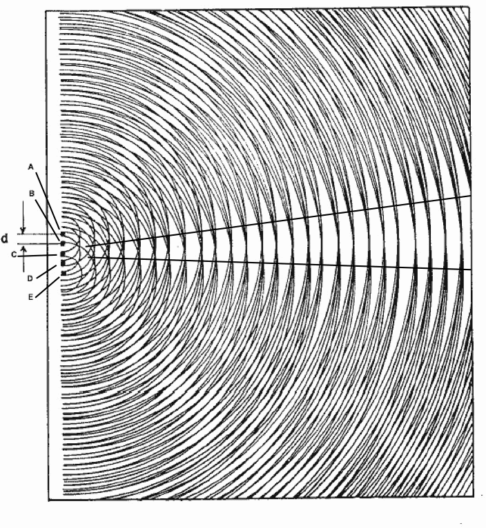 我們再來看看電子掃描,如果圖中的五個發射單元,以C單元為中心,依照跟C單元的物理距離為提前和延後發射時間參數,因為發射時間的先後次序,表現為波形的相位差別,所以這個動作,叫做移相。如果按照C,B,A次序逐次延後發射,而同時按照C,D,E次序逐次提前,離開C點的物理距離越遠,延後和提前的時間越長,這時震幅疊加以後的電磁波就會沿著一定的方位角,從C往B,A方向偏轉,偏轉的角度,跟延後和提前的時間間隔同每個發射單元之間的物理距離d有關,反之,就會往C,D,E方向偏轉,這就是所謂的電子掃描。完全沒有機械參與其中。