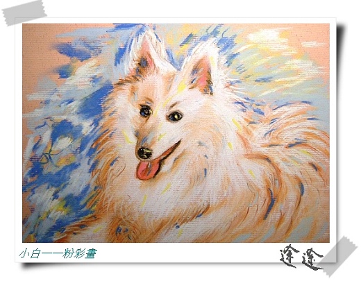 說牠是大帥狗,沒有圖片卻缺乏說服力,不得已只好上網找圖,尋找與小白類似的身影,以圖為藍本,再融入記憶,畫成我印象中的小白……