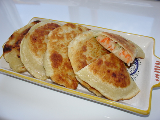 冰箱沒青菜只剩一大條白蘿蔔﹐所以揉了燙麵做了幾個蘿蔔絲餅配湯吃。圓形的餅整形上有點困難﹐因我的技術不佳﹐最後弄成韭菜盒子的樣子﹐一樣好吃!