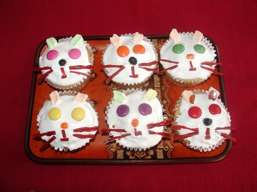 上個禮拜和媽媽一起做了這些可愛的貓咪杯子蛋糕﹐禮拜六女友帶著她女兒來家裡玩﹐下午茶時間一到﹐我拿出來讓女孩們當點心配一杯牛奶﹐三個女生看到開心極了。