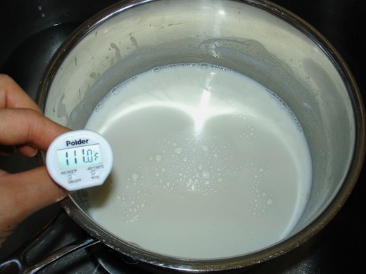 把1250c.c.的牛奶加熱到82度C (華氏180度)﹐或到幾乎快滾﹐需要不停攪拌避免鍋底燒焦。