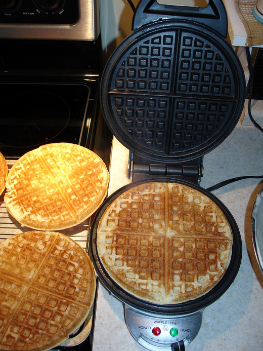 週末的早晨﹐先放音樂迎接美好一天的來臨﹐接著我通常會慢慢地開始做些平日早餐不常吃的﹐也就是比較費時的早點。格子鬆餅很得小孩們的喜愛﹐做的時候可以多做幾個冷凍起來﹐這樣平日要吃的話就非常方便。從冷凍拿出的鬆餅﹐只要在烤箱裡或切小塊放麵包機裡烤到酥﹐味道跟新鮮做好的一樣美味。