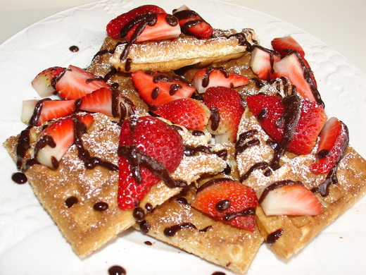 本地出產純楓糖漿﹐自然且風味又佳﹐不是市售的美式糖漿能比得上的。所以格子鬆餅的吃法有很多種﹐最容易的是在烤酥的熱鬆餅放一小塊奶油﹐再淋上楓糖漿。吃鬆餅搭配香醇奶油與楓糖﹐真是令人滿足。我們家的小姐們喜歡在鬆餅上放很多鮮果如草莓藍莓覆盆子等﹐再淋上巧克力醬。我最愛的則是搭配水果和香草優格。