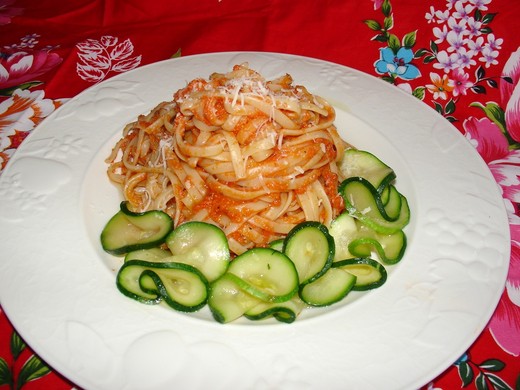 煮麵: 滾一鍋水﹐加2小匙鹽﹐下麵﹐煮到麵熟而不爛。水瀝乾﹐拌醬汁。最後撒點起司粉。