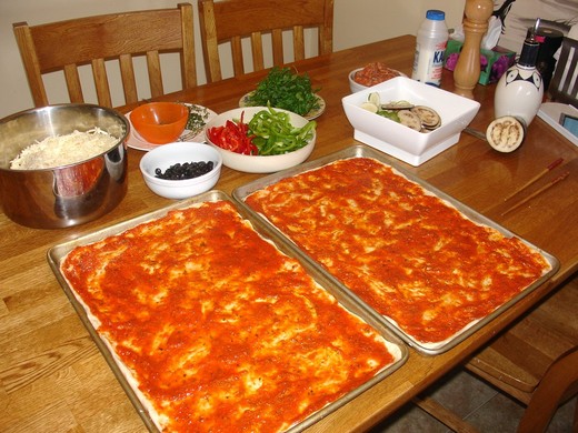做pizza如同做壽司。基本上就是趁發麵的時候把需要的配料先準備好﹐等麵團發好﹐把麵團上些油推開﹐再鋪上喜歡的配料﹐隨個人喜好組合完成﹐送進烤箱高溫烘烤。剛烤好的比薩餅皮脆酥酥﹐融化的起司香噴噴﹐不知不覺就能吃掉一大片﹐這就是幸福的味道! 為了讓家人能攝取更多的纖維和維生素﹐我喜歡添加全麥麵粉﹐讓成品好吃而不失營養。