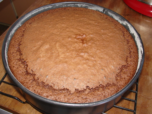 蛋糕糊倒入模型裡﹐表面抹平。送入華氏350度烤箱﹐放中層﹐烤30分鐘。如果中間看起來稍微沒有完全熟透膨起﹐關掉烤箱﹐把蛋糕放裡面悶5分鐘。出爐後載架子上放涼。