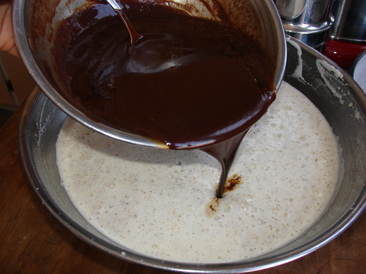把咖啡巧克力倒入杏仁蛋糊裡拌勻
