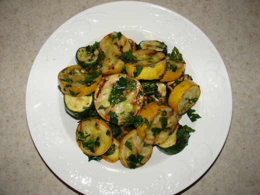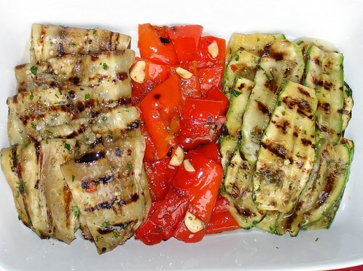適合做這道烤時蔬的蔬菜有彩椒﹐茄子﹐櫛瓜﹐蘑菇等。處理的方式大致上是把茄子和櫛瓜洗乾淨之後切成薄片﹐然後撒些鹽讓苦水釋出。烤之前要把水份用廚房紙巾擦乾﹐以大火烤熟。烤茄子和櫛瓜片的時間不需要很長﹐幾分鐘就可以烤出烙紋。