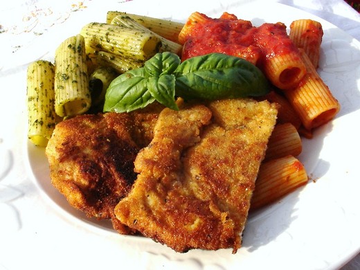 義式雞排不必下油鍋炸﹐它的粉衣煎好以後也很酥﹐裡面的雞胸肉有蛋汁和麵包粉裹著﹐肉不與熱油直接接觸﹐水份不易流失﹐所以吃起來鮮嫩多汁。麵包粉裡加了香草料和帕馬森起司粉﹐味道充滿異國風味。今天的晚餐我們吃雞排搭配雙色義大利麵﹐很受家裡小朋友的歡迎。