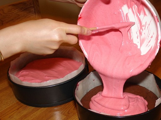 蛋糕糊平均倒入兩個蛋糕模裡﹐表面抹平。送入華氏350度烤箱﹐放中層﹐烤20分鐘。如果中間看起來稍微沒有完全熟透膨起﹐關掉烤箱﹐把蛋糕放裡面悶5分鐘。出爐後載架子上放涼備用。