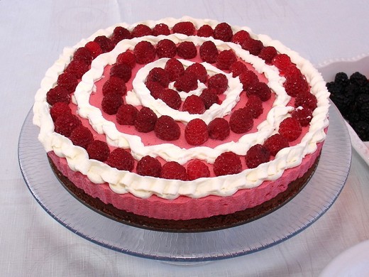 最後在慕斯上面用鮮奶油和新鮮覆盆子裝飾。