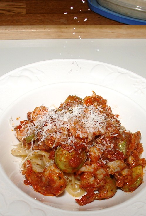 煮500克乾的義大利扁麵條或筆管麵﹐煮的時候水裡加2小匙鹽。麵煮熟以後把水瀝乾﹐倒入蕃茄魚蝦麵醬裡拌勻。再放些橄欖油拌一下﹐最後撒上帕馬森起司或pecorino romano起司。voila!