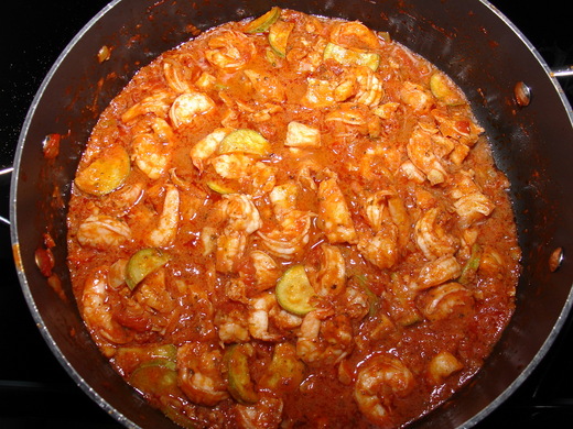 4 把魚塊蝦仁和櫛瓜片加入﹐火稍微開大﹐醬汁收到幾乎看不到水份且魚蝦熟透了就起鍋。