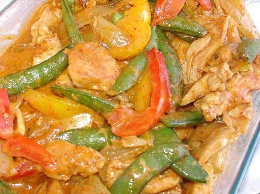 5 雞肉片9分熟時把炒過的蔬菜倒下加入。拌炒均勻﹐讓湯汁稍收到稠即可。
