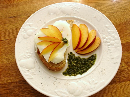 現在正是桃類的產季﹐每顆都很甜很多汁。在盤底放一塊五穀麵包﹐上面放蛋﹐切幾片玫瑰桃﹐搭配青醬﹐漂亮又好吃。
