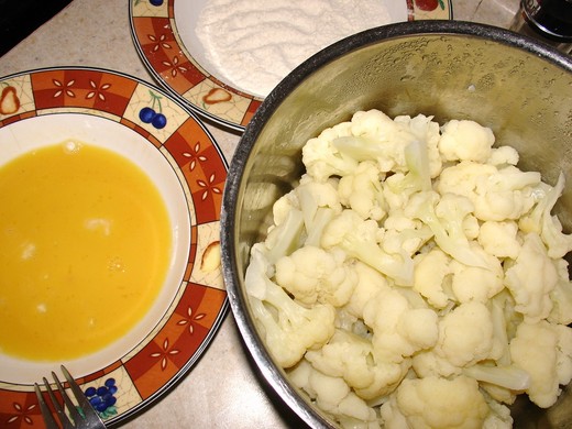 處理花菜的時候儘量不要切太小塊﹐以免水煮的過程中煮太爛﹐要沾粉的時候不好操作。還有﹐花菜感覺有熟就可以起鍋﹐稍微硬一些沒有關係﹐因為還要下鍋炸﹐炸一下就軟了。水煮完畢以後水要瀝很乾﹐之後的沾粉動作才不會黏的不好處理。