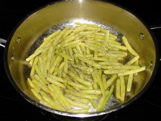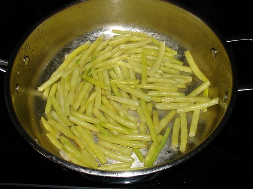 1 炒菜鍋裡放3公分的水﹐把600公克洗好切對半的蠟豆倒進去﹐加1小匙鹽﹐攪拌一下蓋上蓋子以大火煮到全部水份完全蒸發。