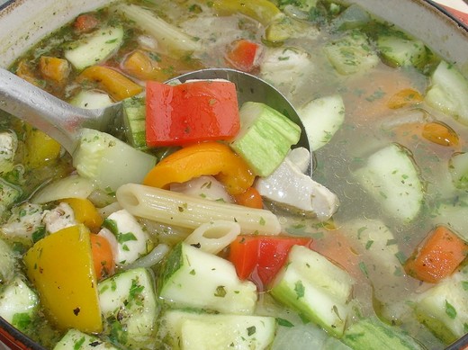 2大匙油﹔1個洋蔥切大丁﹔雞高湯1.8公升﹔紅蘿蔔2小條切滾刀﹔鹽1小匙﹔黑胡椒少許﹔雞胸肉1付切丁﹔櫛瓜1條切滾刀﹔彩椒1個半切成一節拇指大小﹔新鮮巴西利3株切碎末﹔乾牛至1/2小匙