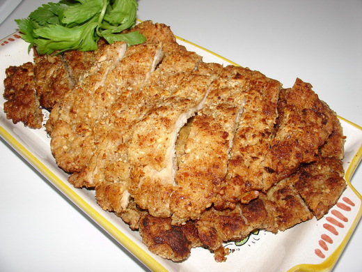 用咖啡豆研磨機打出來的杏仁果粉代替地瓜粉﹐多了杏仁果香﹐煎好以後的豬排外衣酥脆可口。這豬排不必下熱油炸﹐我在平底鍋裡放油﹐雙面煎到金黃色就起鍋。我用杏仁果是因為家裡地瓜粉用完了﹐結果成品的口感出乎意料的與用地瓜粉炸出來的相仿。