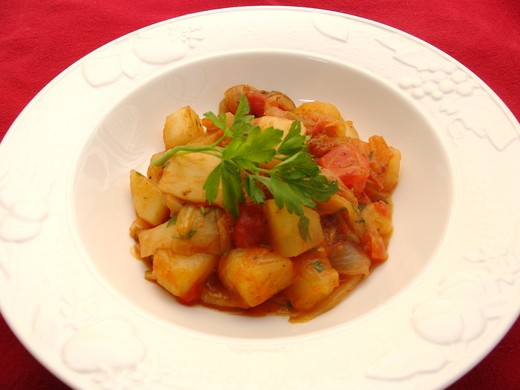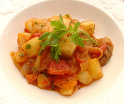 很平凡的洋蔥馬鈴薯紅番茄和紫茄﹐經過中小火慢炒和一陣快燉之後﹐簡單的美味就這樣產生了。這道燉菜很適合與魚或雞肉一起吃﹐已經有馬鈴薯的澱粉了﹐不需要米飯或麵條就很豐盛了。