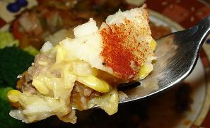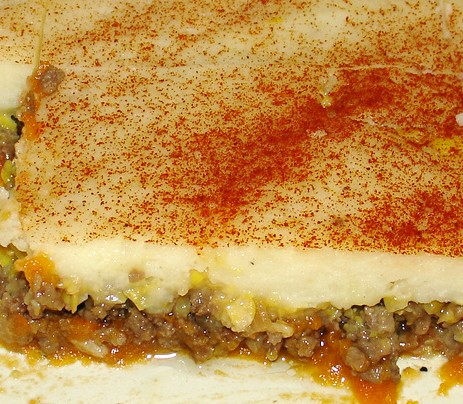 組合: 長方形烤盤裡先放甘薯泥﹐表面刮平。倒玉米醬﹐抹平後撒微量的鹽。把炒鍋裡的牛肉碎舀到玉米醬上﹐最後用湯匙把馬鈴薯鋪上。