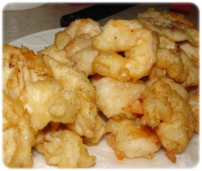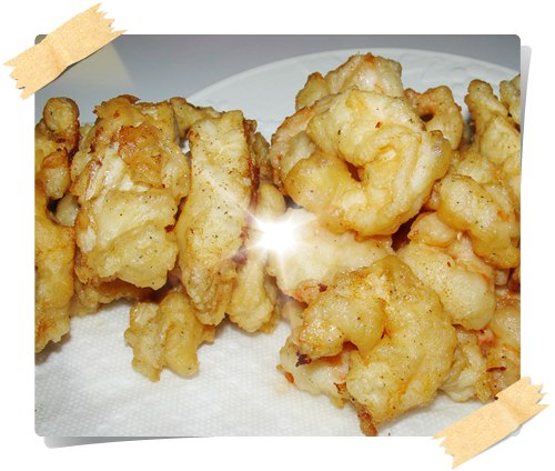 平常不喜歡吃魚的小女兒可以把一大盤剛炸好﹐香酥的魚塊和蝦仁吃光光。除了魚和蝦以外﹐也可以同樣的方法和麵糊炸花枝圈和其他海鮮。