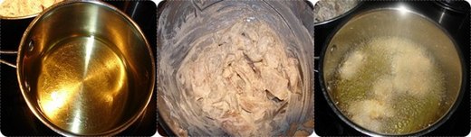 3 中型湯鍋裡熱半鍋油﹐油熱了以後把魚塊和蝦仁小心地夾進油裡炸﹐外皮呈金黃色即可撈出來把油瀝乾。享用前撒少許白胡椒。