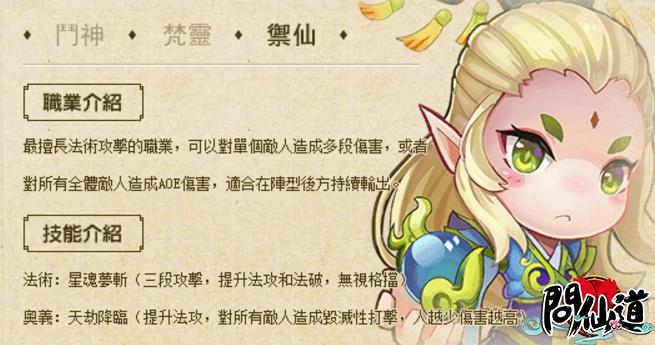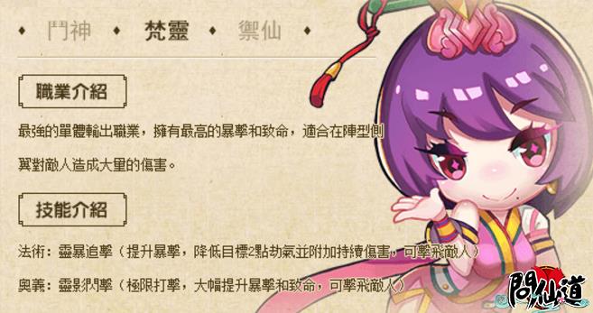 在這款遊戲當中共分擅長防禦「鬥神」、最強的單體輸出的「梵靈」以及操控法術攻擊的「禦仙」三種職業,供玩家參考選擇,三種職業都具有不同的特性和技能專長,玩家必須要依照自己的個性和喜好挑選出最適合自己的職業。