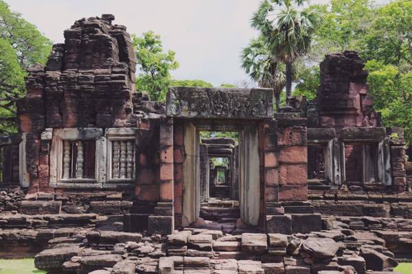 整座寺廟被樹林所環繞,還未入門,濃厚的佛教感便迎面而來。由於歷史上主流宗教的改變,披邁寺的建築裝飾多為印度教風格,而寺廟供奉的卻是大乘佛教的佛陀神像。