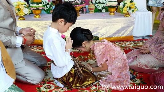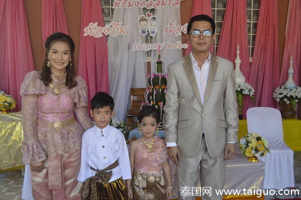 泰國那空帕儂府一對父母依照泰國傳統婚嫁儀式給他們年僅5歲的龍鳳胎兒女舉辦了婚禮,驅除厄運。父母按照習俗為兩個孩子準備了10萬銖(約2萬元)的現金和9銖重的金飾作為聘禮,只為能驅除厄運,保佑孩子健康成長,當地一些親朋好友參加了這場婚禮。