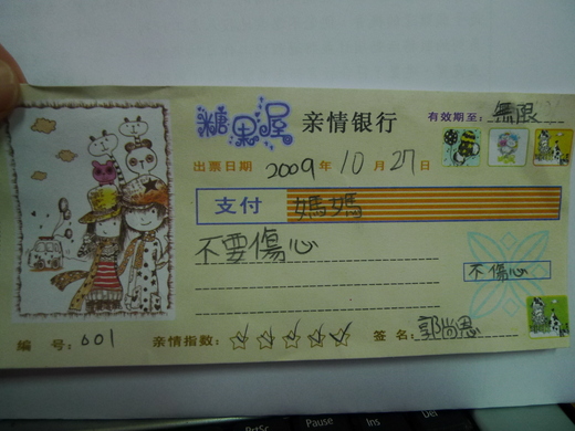 女兒看我掉眼淚不止一次了,昨天她一放學回家,就開心地開了一張支票給我,有效期是「無限」,支付給媽媽,支付面額是「不要傷心」,下面還有她的小小簽名,這張由親情銀行開出的支票,又讓我感動得掉淚,縱使在很多其他方面失去很多很多,不過女兒給我的,真的是世界最珍貴的,雖然是一張玩具支票,但是她的祝福,媽媽一定努力兌現。