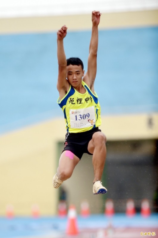 苑裡高中林佳興跳遠跳出7公尺51,創下個人最佳紀錄,拿下本屆全中運金牌。(2017.04.27.自由時報廖耀東攝)