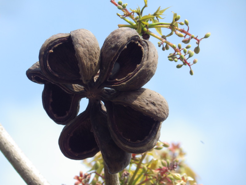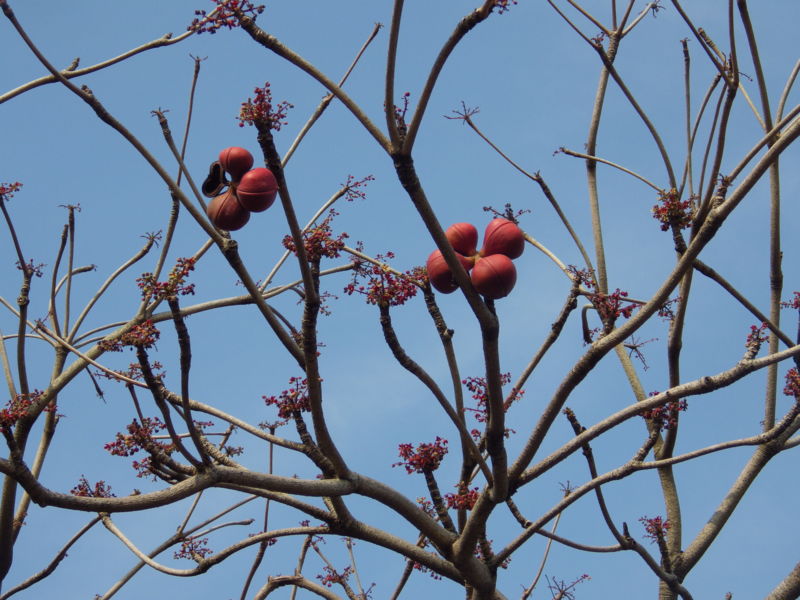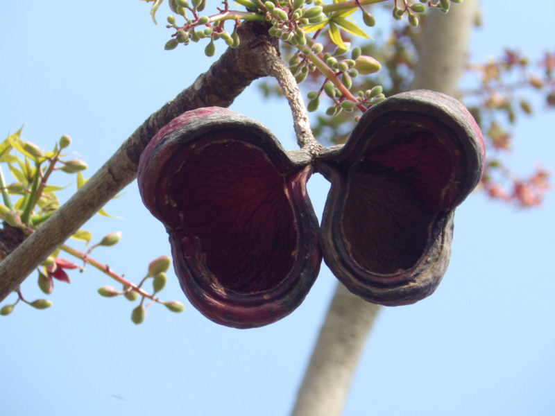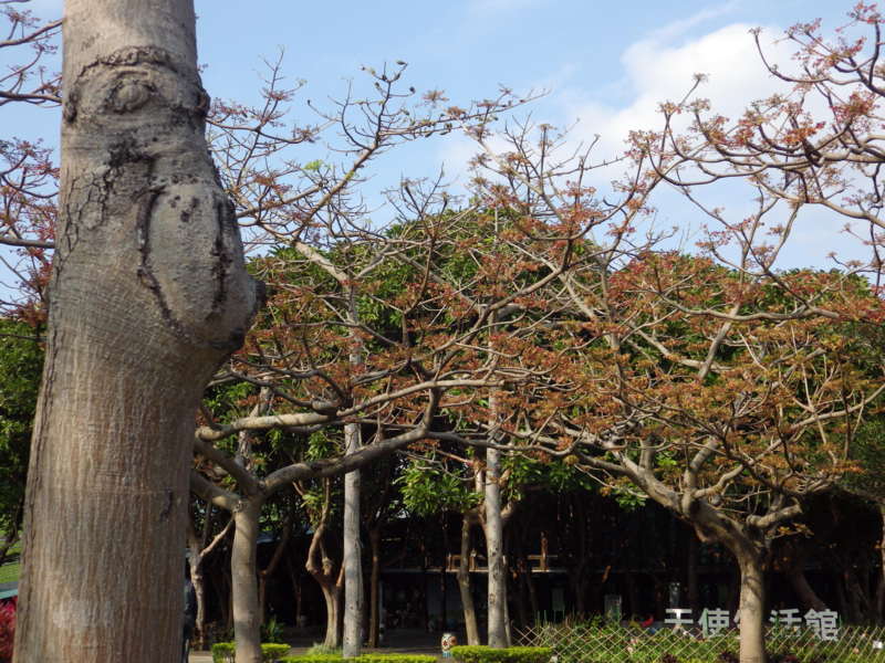 上網查了資料,掌葉蘋婆,屬熱帶植物,亞洲、非洲、澳洲都有,大約在 1900 年間由印度引進台灣。它是落葉喬木,樹高可達 25 公尺。掌狀複葉,簇生枝端,小葉 7~9 枚,橢圓形,先端尖。圓錐花序頂生,花被五裂,具強烈異味。蓇葖果壓扁球形或木魚形,果徑 7.5 公分以上,淺紅色。初春時,開著臭味的暗紅色小花;同時,淡紅色的新葉,著生枝頂,真是好看。夏天時,滿樹蒼綠,掌狀複葉,簇生於枝端。秋天時,葉黃困綠,神奇的造物者,已將那偌小的小花,孕育成拳頭般大的果實。冬天時,葉落枝枯,掛滿了整樹開裂的紅果,而它的果實造型奇特,硬碇紅色的外殼,像極了木魚,熟時裂開一側,露出紫黑色的種子。