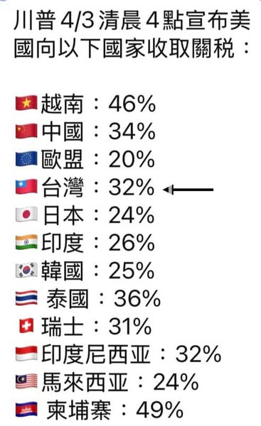 台積電要去美國投資天價1650億美元,送給美國無數工作機會,以及本應在台灣進行的鉅額投資,但結果卻還要被課32%的高額關稅,比韓國、日本、印度、馬來西亞都高,僅低於中國2%。這樣的結果將嚴重衝擊台灣以出口為主的貿易,勢必重創台灣的工具機、電子機械、資通訊與汽車零組件等產業。目前台灣面臨如此的外部衝擊,朝野非但沒有攜手共謀對策以度難關,還在搞大罷免。台灣內部的政治紛爭、族群對立,又遭逢美國高額關稅的嚴重衝擊,對於台灣目前的處境,只能用「痛心」來表達個人的感受。(以上文、圖,摘自鄭世岳臉書)