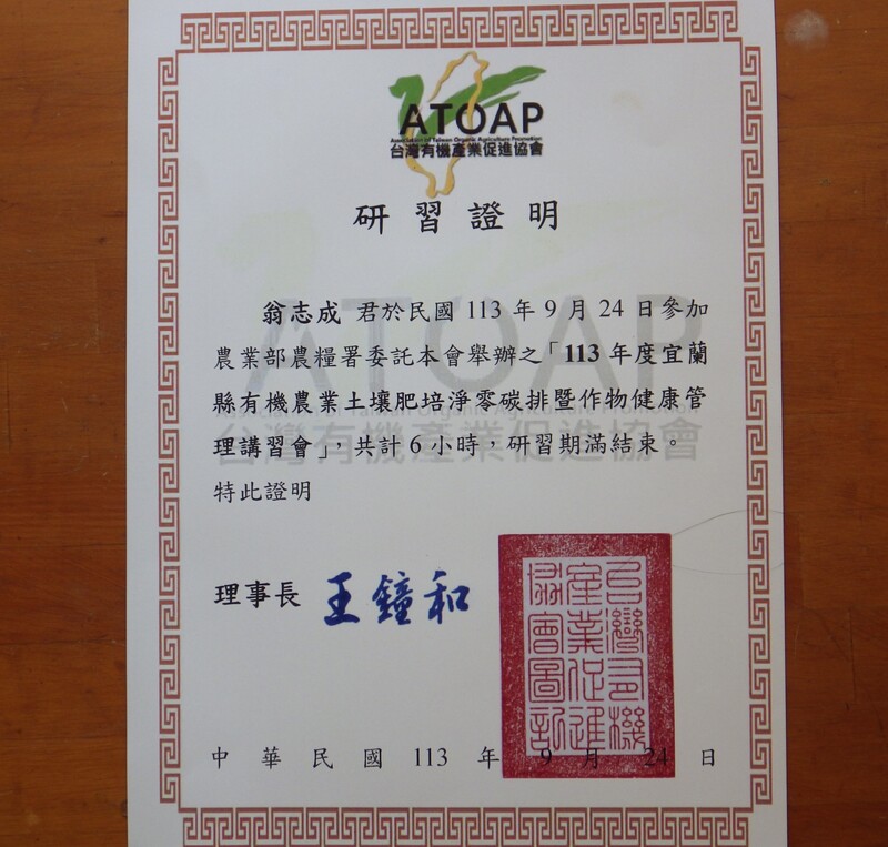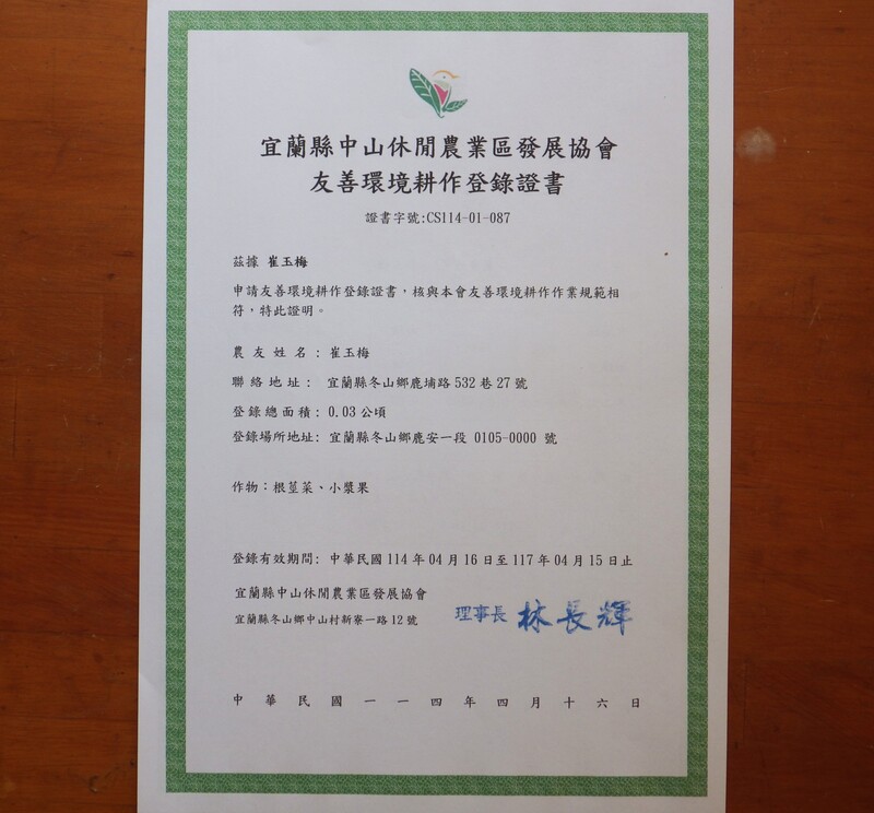 去年向本莊園所在地的宜蘭縣中山休閒農業區發展協會友善環境耕作認證申請,於今年四月十四日,該協會理事長及檢測員兩人,親自到本莊園很仔細查驗、詢問,並照相、紀錄送協會,終於到六月二十日接到認證通過通知。