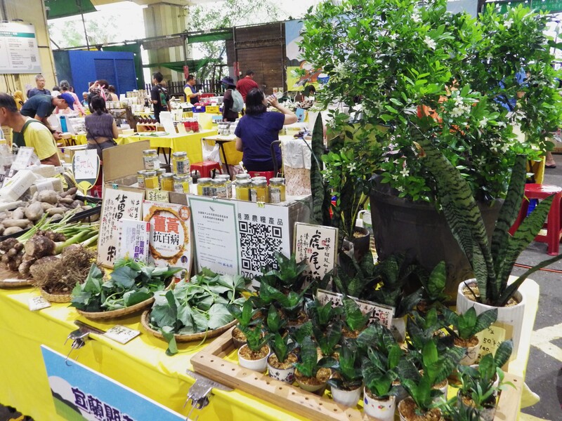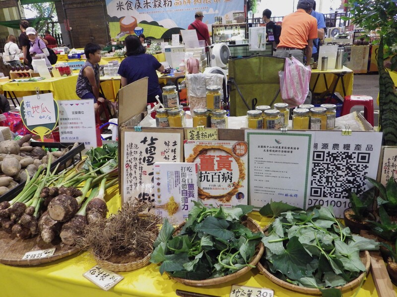 本次出展農產品,大同小異,大同是薑黃粉及盆栽,小異是產季關係,這次展出如花生根、芋頭筍、地瓜葉及皇宮菜心。
