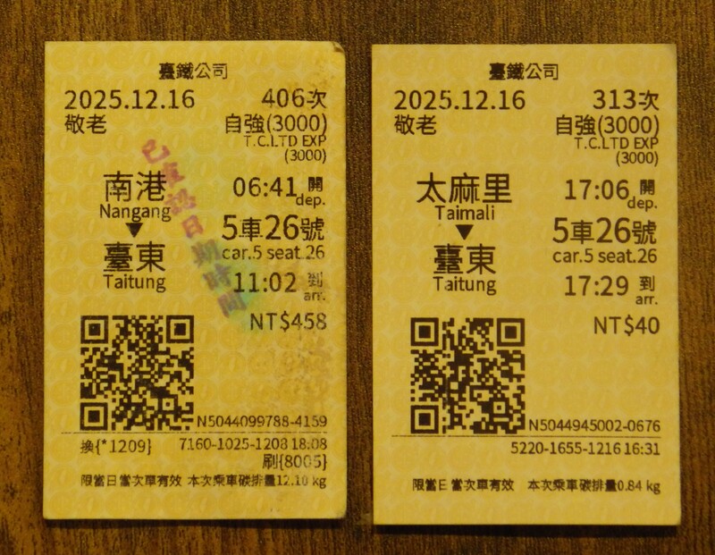 同一天(12/16),這天完程,從太麻里車站現場買的17:06自強號,沒有指定座位,電腦隨機跑出如圖這張5車26號座位車票。我眼睛一掃,感覺這座位有點眼熟,從隨身包包,找出早上的車票,嚇了一跳,座位完全一樣,這機率也太微了吧!我應該去買樂透的。