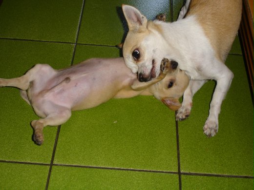 咳.......這麼說好像有點怪= =但是我只能說我家胖嘟根本就是在''玩''他的兒子。這幾天觀察下來,胖嘟從未露出該有的''父愛'',反而每次都把他兒子當玩具般的咬來咬去,用那細瘦的狗掌把他兒子翻來翻去。