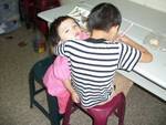 兩人都沒有讀幼稚園,所以來了陪讀班。因為奶奶住院,本來媽媽要叫一個小二的哥哥和這個6歲的男孩回家照顧這個妹妹,可是這會觸法,也太不忍心,所以老闆把他留在教會,妹妹像一隻無尾熊一樣巴住哥哥。這個畫面就是老師在讓哥哥練習,他一手要寫字,一手還要安撫在哭的妹妹,說實在的,我在拍照時其實好心疼,好想哭!