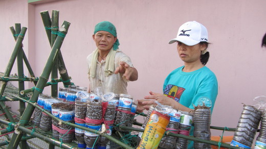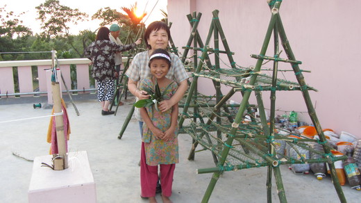 100/05/20 : 小女孩摘花來送給我. 旁邊是我們剛做好的竹架, 地上是我們剛完成的一罐罐有機土壤