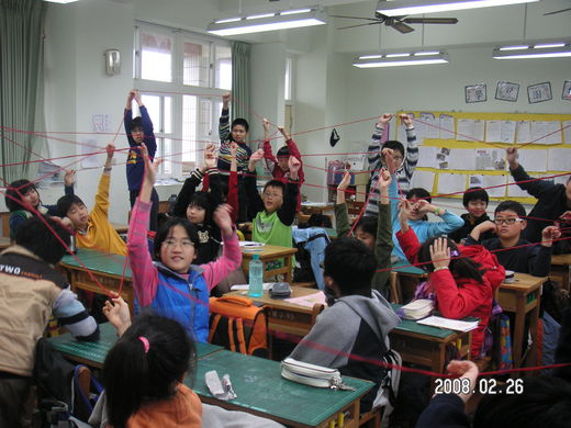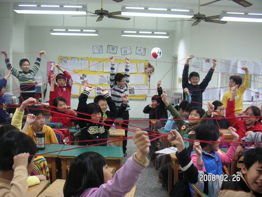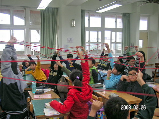 在『人活在關係中』人際網絡體驗活動中,看到彼此關係密不可分,真是神奇呀!這當中有很大的樂趣也有困擾;例如同學反映:我想傳給他但他不接受怎麼辦?同學在很遙遠的對面,怎麼辦?我一時想不到祝福的話但同學毫不客氣的催促,怎麼辦?當繩索緊密纏繞在我周圍時,我要如何保護自己?有的同學一直緊握繩子,無法察覺何時該放鬆繩子……也有同學不願意握住繩子,把自己排除人際關係之外;在傳繩索的活動當中,所發生的任何小事件都可以與人際互動關係相呼應;很妙吧!有時候會將自己陷在困境當中而不自知,同學有沒有注意到,在生活中,我們和其他人關係絕對是彼此相連的,有些人樂在其中,有些人失去耐性,也有些人急中生智;這個體驗馬上就讓你明白,這當中需要包容和關懷甚至要耐心等待……有時候有點摩擦,就算盡量避免往來,還是會發生一些問題,對大家都會產生影響,有時候還會打結。對,會打結,我們也藉由兩組同學雙手胸前交叉相互牽手解一個動彈不得的結來引導大家,大家有沒有體認到,要能解決問題,一定得要彼此協調,有的人退讓、有的人前進,共同思考合宜的解決問題方式,才能順利的把結打開,才能有和諧的關係。