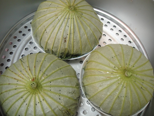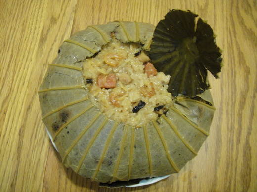 4.荷葉用熱開水燙軟後放在大碗公上攤開,梗心對準碗中央,將做法3.材料放置荷葉裡,直到碗滿再將荷葉包起並壓緊實,將荷葉飯倒扣盤上並在梗心附近戳些洞透氣,就可上蒸鍋蒸了。