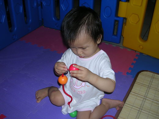 妍妍非常專心的串珠珠,手眼協調發展很好,很小的孔也能對準和穿入,對一個一歲大幼兒而言,非常不容易!注意妍妍都是用二指抓或三指抓來完成的唷!日常生活中例如握筆寫字、拿筷子都可由這個動作延伸的;可別小看唷.....看那專注的神情......