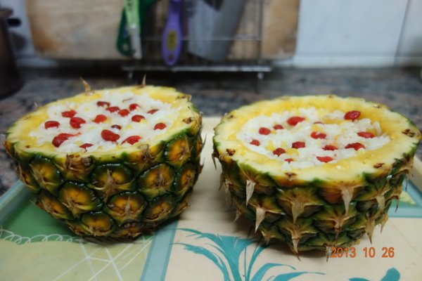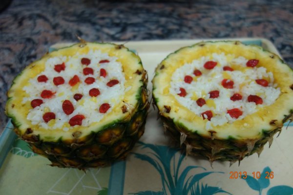 將拌勻的鳳梨飯 放入剛剛挖空備用的鳳梨中/放些枸杞妝飾.