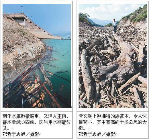中部重要水源地德基水庫和集集攔河堰,因風災沖進泥砂、枯木,供水功能均嚴重打折。德基水庫即使不斷疏濬、挖砂,卅年來庫容量仍減少百分之廿。