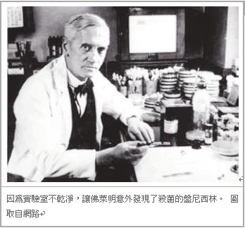 1928年蘇格蘭生物化學家佛萊明 (Alexander Fleming)在實驗室培養金黃色葡萄球菌,意外發現金黃色葡萄球菌生長的培養皿中,長了一塊青黴菌菌落其周圍沒有細菌滋長,這是科學界第一次發現能抑制、消滅細菌的「敵手」。1935年英國病理學家弗洛里(Howard Walter Florey)、德國生物化學家錢恩(Ernst Boris Chain),藉由純化技術,從青黴中萃取出青黴素(penicillin)。1941年人類首次使用抗生素盤尼西林,對抗細菌造成的感染疾病,讓人類與畜養動物在對抗傳染病的生死搏鬥中,取得了優勢。