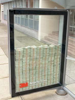 在加拿大溫哥華市的不少公車站旁,都擺著個玻璃製成的扁箱子,裡面裝的是:鈔票!鈔票貨真價實,金額巨大,而且,只要你能把玻璃打破,這些錢你就可以通通拿走。猜出來了吧?這是安全玻璃廠廠家的廣告。據說還真沒人打破過這些玻璃呢。